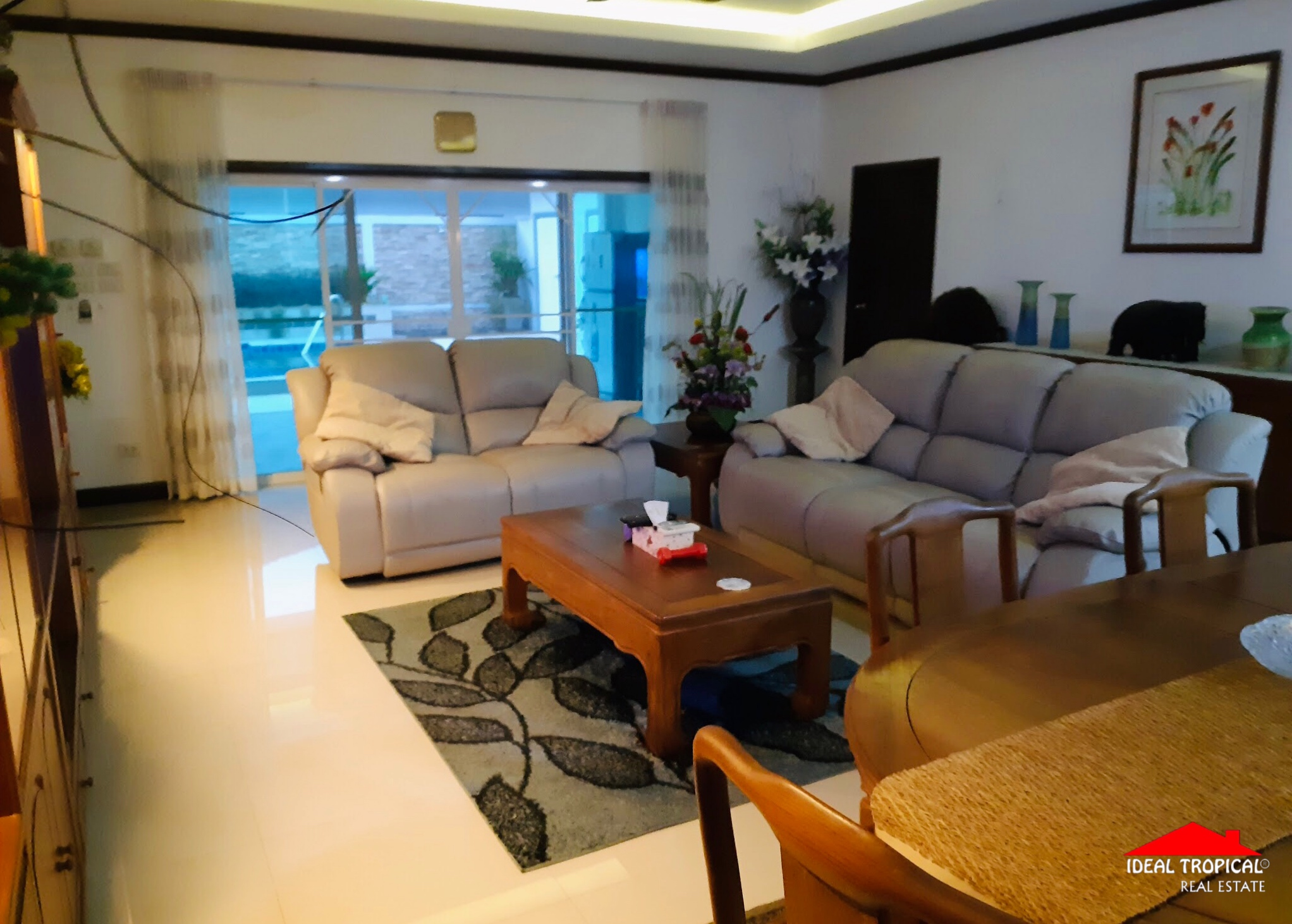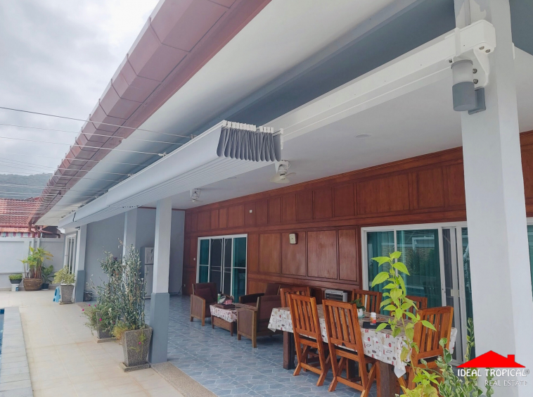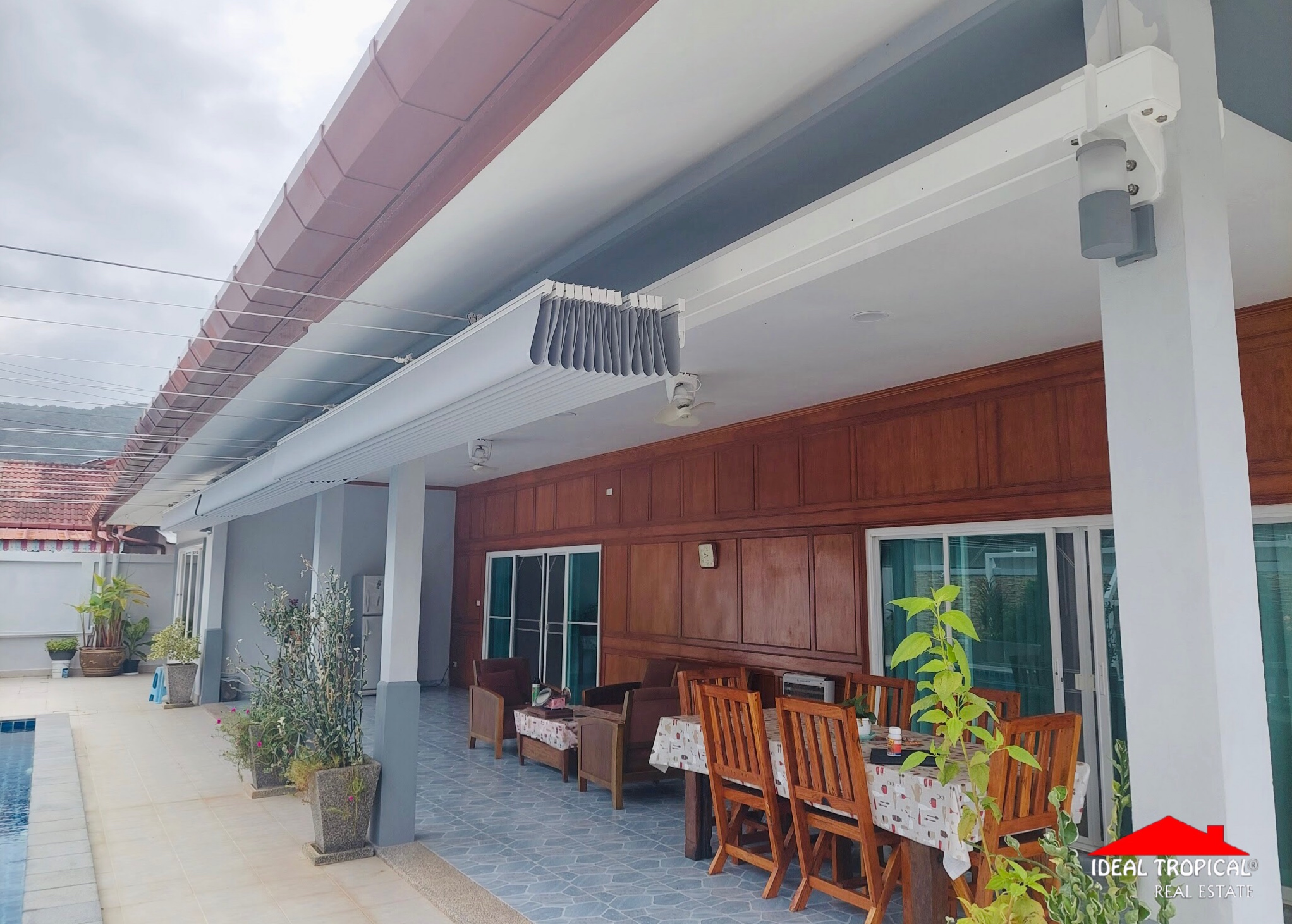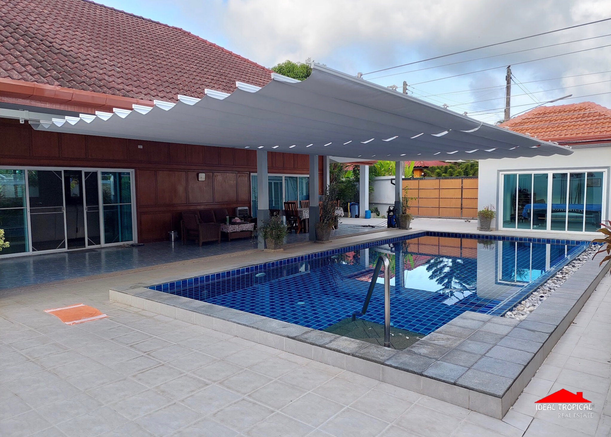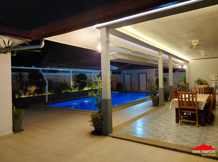 The villa has 2 private car ports and electronic security gate and a gate house with a professional pool table etc. The gardens are easy maintenance with own water well.
